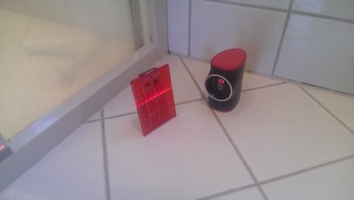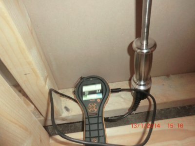 Fuktsøk, unormalt høyt utslag under flis på vegg.